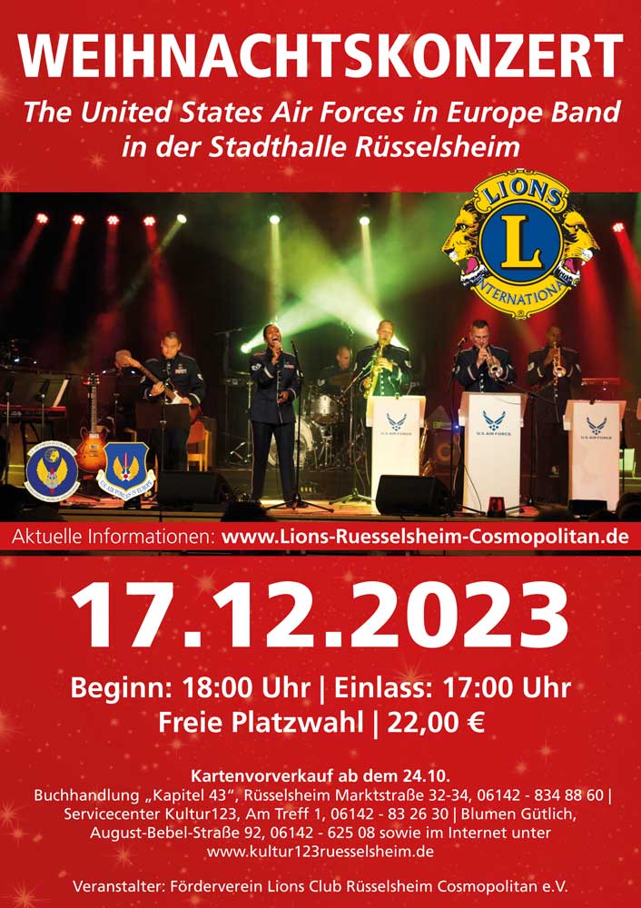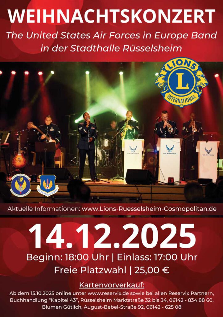 Erleben Sie am 14. Dezember 2025 das 11. Weihnachtskonzert des Lions Club Rüsselsheim Cosmopolitan mit der USAFE Concert Band Europe. Freuen Sie sich auf einen stimmungsvollen Abend voller musikalischer Highlights – von traditionellen Weihnachtsklassikern bis zu mitreißendem Big-Band-Sound.