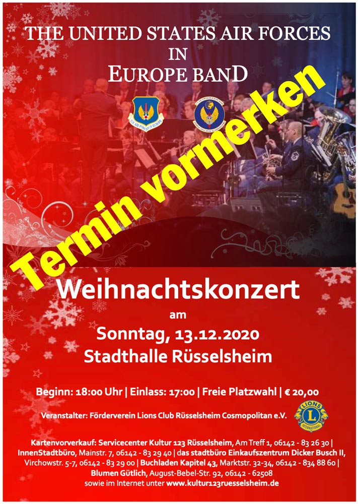 Auch in diesem Jahr dürfen sich Musikliebhaber wieder auf ein besonderes Highlight in der Vorweihnachtszeit freuen: Der Lions Club Rüsselsheim Cosmopolitan lädt gemeinsam mit der renommierten USAFE Concert Band Europe zum 11. Weihnachtskonzert in die Stadthalle Rüsselsheim ein.